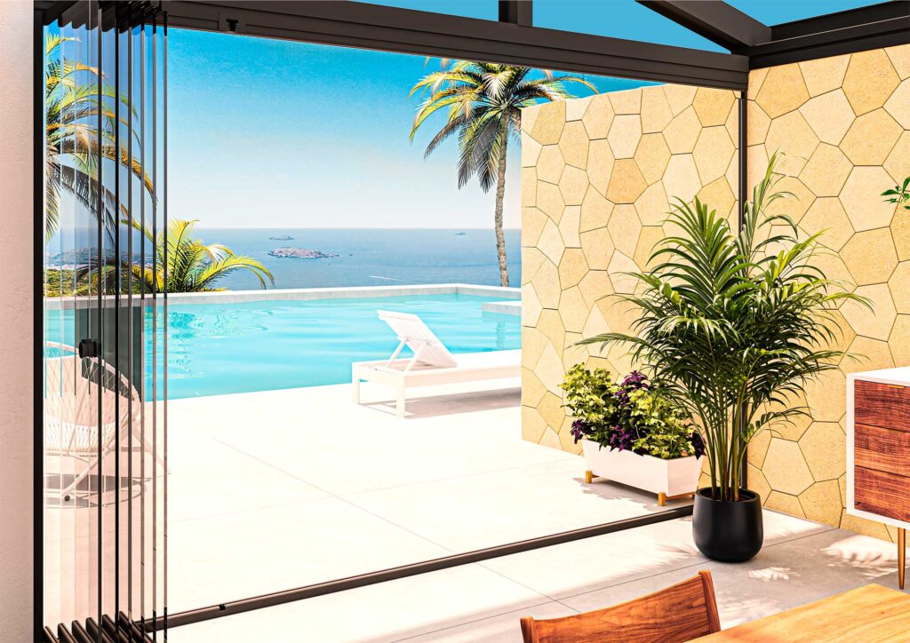 Folding glass curtains are versatile and elegant solutions for enclosing terraces, porches, balconies or commercial spaces without losing natural light and panoramic views. Its tempered glass panels fold laterally, allowing full or partial opening and providing a seamless connection between interior and exterior. This design without intermediate vertical profiles provides a clean, modern aesthetic that is fully integrated into any architectural style. Manufactured with high-strength glass, these folding curtains guarantee security, thermal and acoustic insulation, and durability against inclement weather. Its folding mechanism facilitates handling and allows to adapt the opening to each situation, providing comfort and flexibility in any space. In addition, they require minimal maintenance and are easy to clean, preserving the transparency and impeccable finish of the panels over time. Available in multiple configurations and adaptable to different opening sizes, folding glass curtains combine functionality, comfort and design. Its panoramic style and full opening capacity maximize brightness and transform any room, making it an ideal solution for private homes, terraces, commercial premises or hotel environments where comfort, aesthetics and practicality are essential.