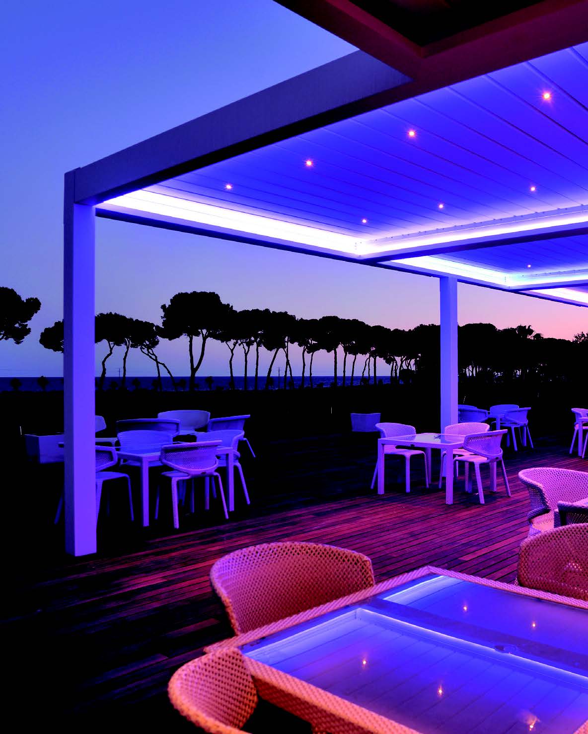 La versatilidad de las pérgolas Saxun en Hermética es única. Podrás poner el techo según tu necesidad, aprovechando su sombra durante el día o quitándolo para disfrutar de la elegancia de la luz de las estrellas durante la noche.